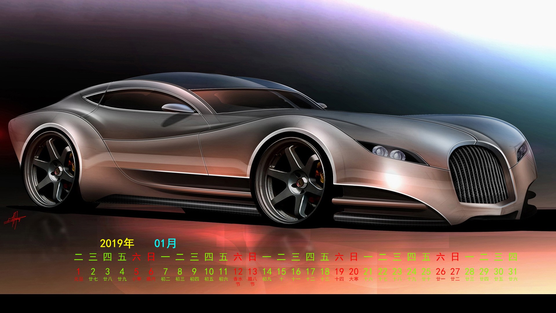 2019年元月跑车宽月历(1920x1080) 壁纸