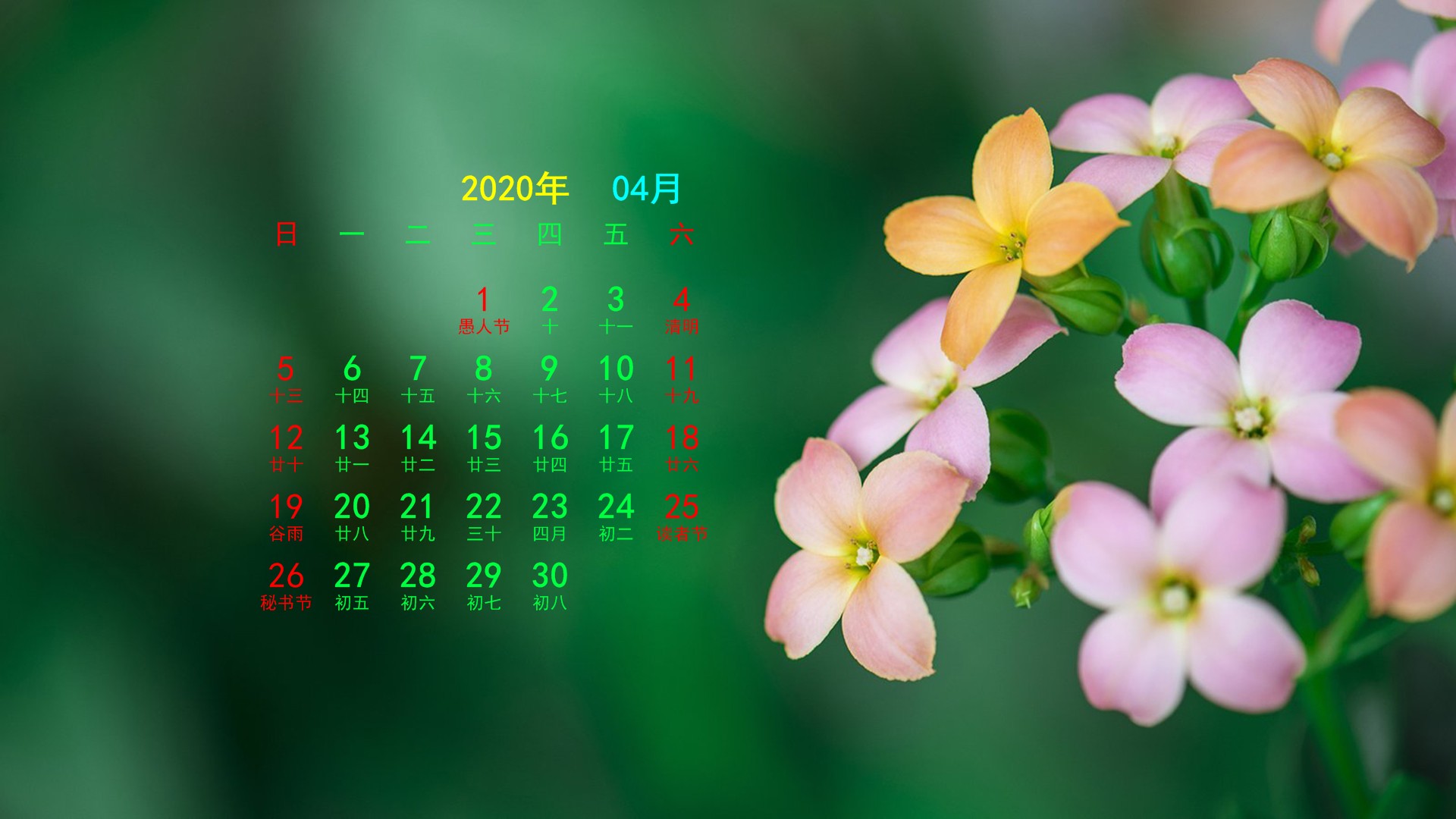 2020年4月花卉宽月历(1920x1080) 壁纸